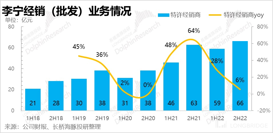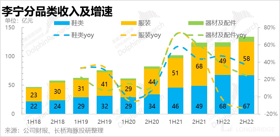 服装类的下滑表现就非常吻合行业的情况,不过由于 21 年下半年李宁的服装品类营业收入基数实在太高(达到 68 亿,历史之最),所以加重了去年下半年李宁在该品类的下滑趋势。