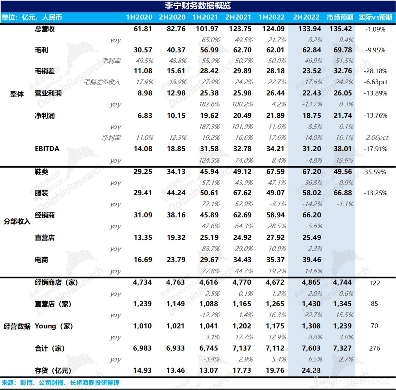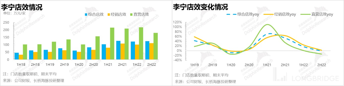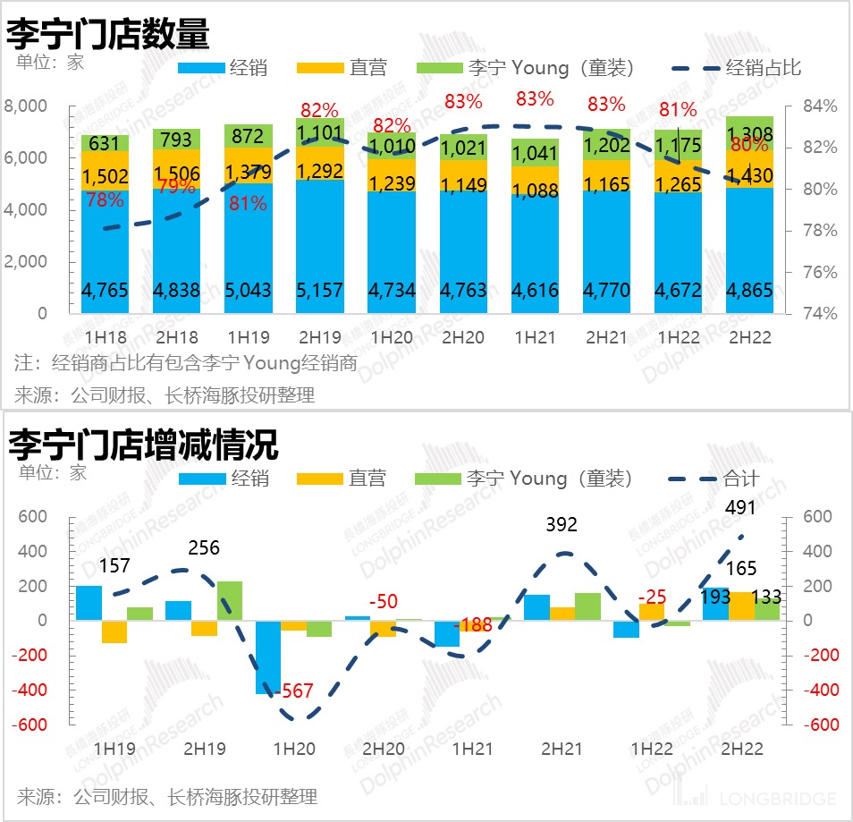 亮点在于去年下半年李宁持续在做以大店为核心的渠道扩张,并且效果非常明显。经销门店和直营门店数量都有超预期的增加。叠加目前有线上被线下分流的趋势,防疫政策调整后线下门店客流逐步恢复,此时的渠道扩张绝对有利于公司份额的持续提升。