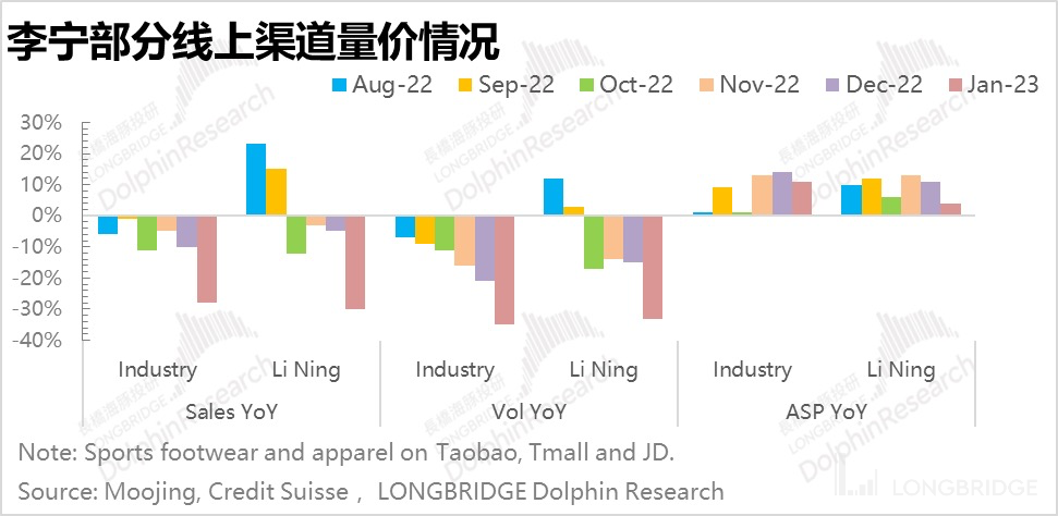 让海豚君觉得比较困难的是,去年下半年能够持平基本上靠 ASP 的提升。以线上销售为例,包括李宁在内的大部分品牌在销量方面表现得十分凄惨,尤其是去年四季度。不过线上目前的占比还不算高,大部分品牌是维持在 30% 左右,主力军还是线下,且最近线上有持续被线下分流的趋势。