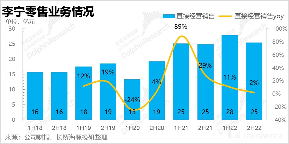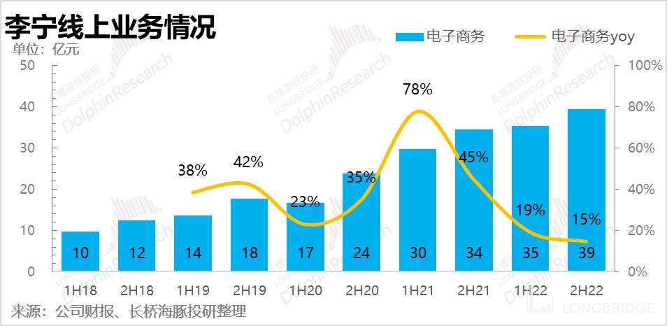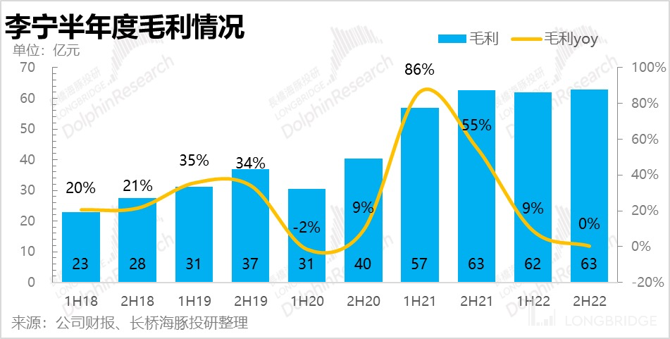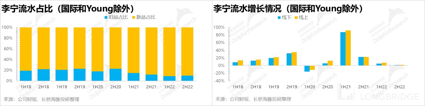 去年全年,**李宁流水端仅有个位数的增长,即使不考虑 2020 年基数的影响(21 年对比 19 年复合增速达到 25-30%),其中的差距也十分明显。**尤其是下半年几乎没有增长,线下门店因为营业时间受限而表现得更为惨烈。