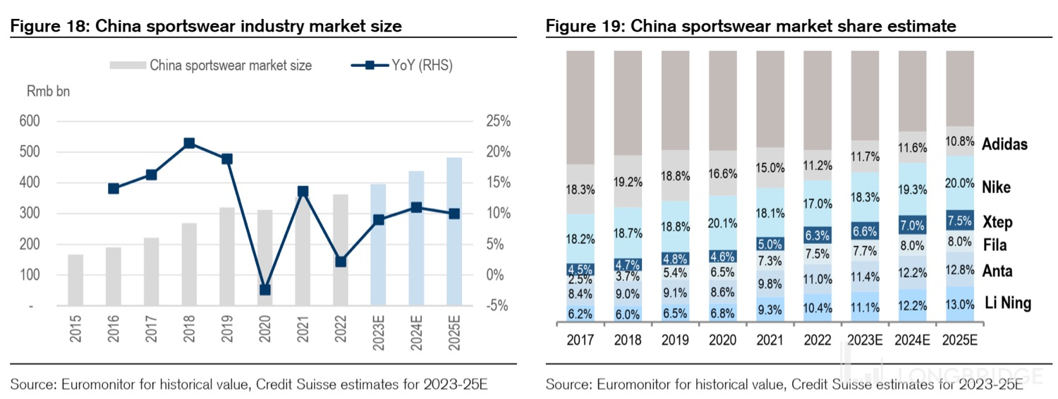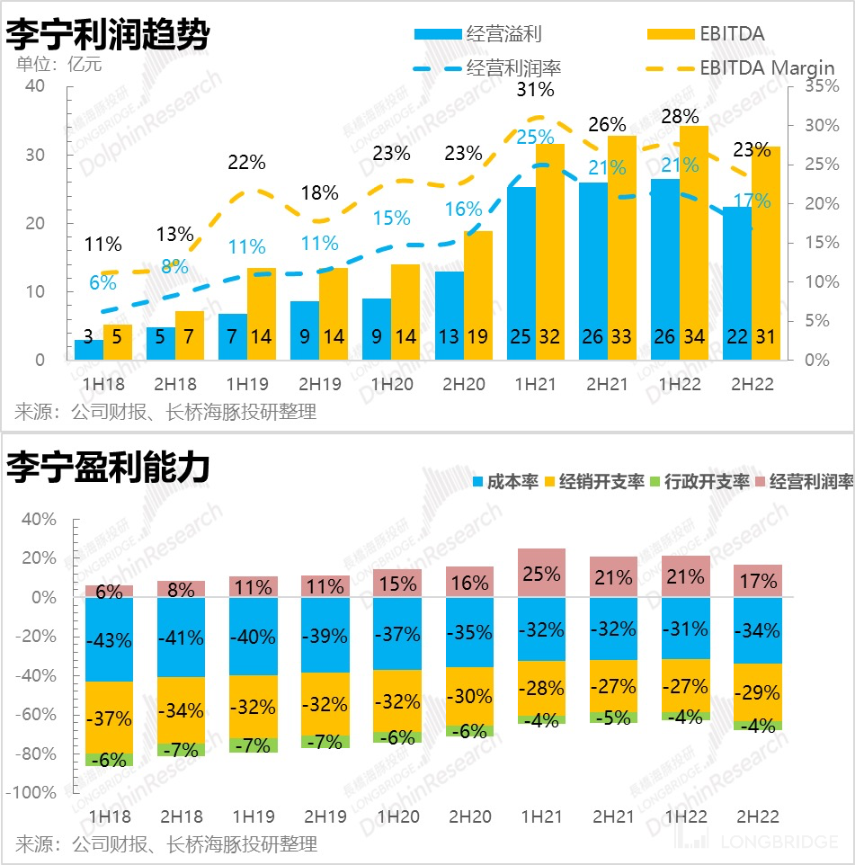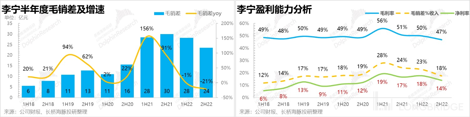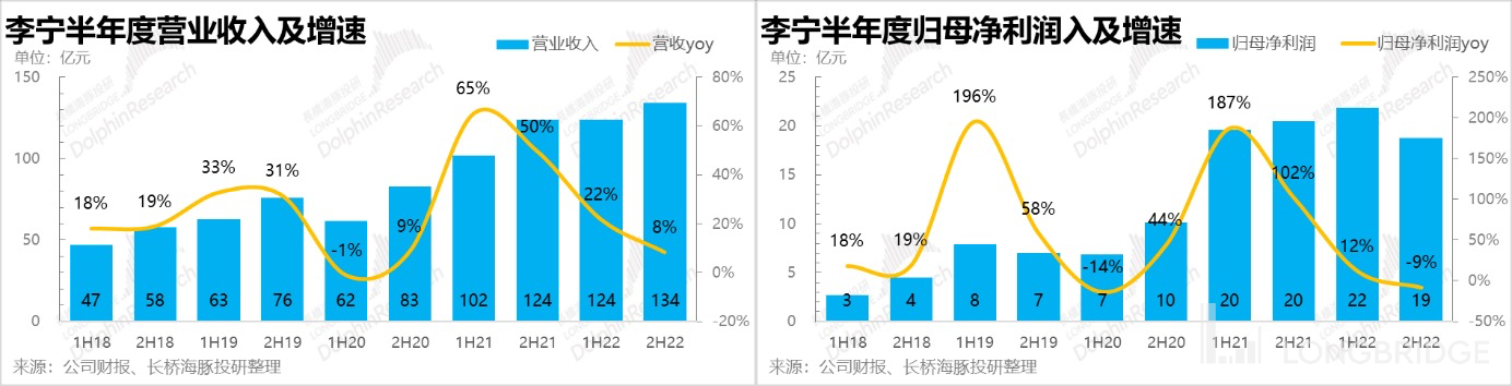整体上看,这两大品类过去(2021 年以前)增速比较接近,基数大了以后(2021 年)开始渐渐拉开差距,李宁比较有优势的鞋类增长后劲比较强。