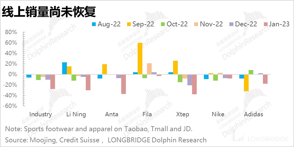 同时线下的表现可能会比较尴尬,从目前检测机构统计到的数据来看,体育服饰的线上销售依旧是持续负增长的状态(数据截止到 1 月份,有部分原因是春节的影响)。