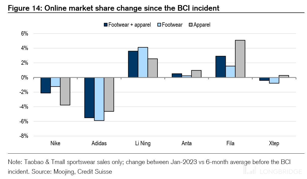另一方面不能忽略的是,BCI 事件的持续影响。拿线上销售举例,淘宝和天猫渠道中,自 BCI 事件发生以来,李宁和 FILA 的市占率的提升情况非常明显,而安踏品牌表现较为一般,特步在大的品类上(鞋类、服装),几乎没有提升趋势。国产高端品牌与非高端之间市场份额提升的差异,其本质是耐克和阿迪客户的偏好在持续转移。