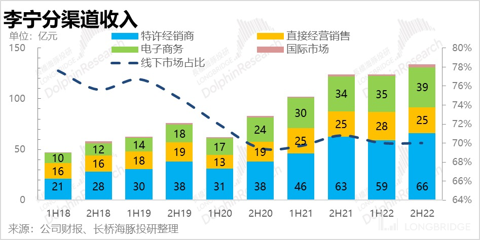 接着我们来看李宁的分渠道表现。公司目前主要的销售渠道还是依赖线下。在电商业务不断猛攻的背景下,线下业务占比依旧牢牢维持在 70%。