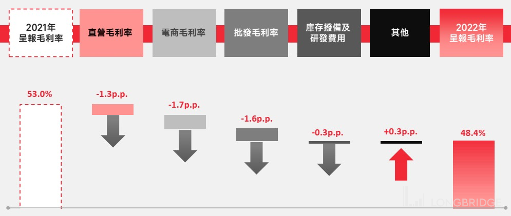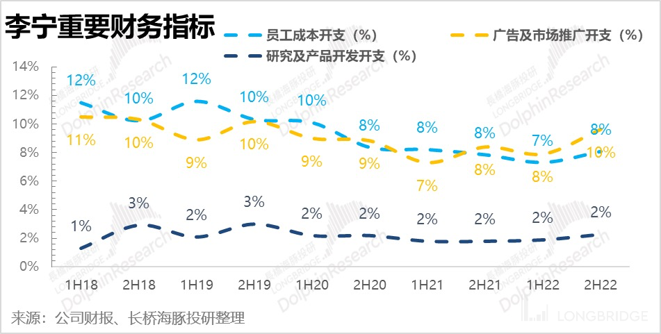 李宁即是如此,在享受了一段时间的高毛利之后,去年下半年也终于扛不住了,自 2021 年以来首次跌破 50%,也是近五年最低的状态。