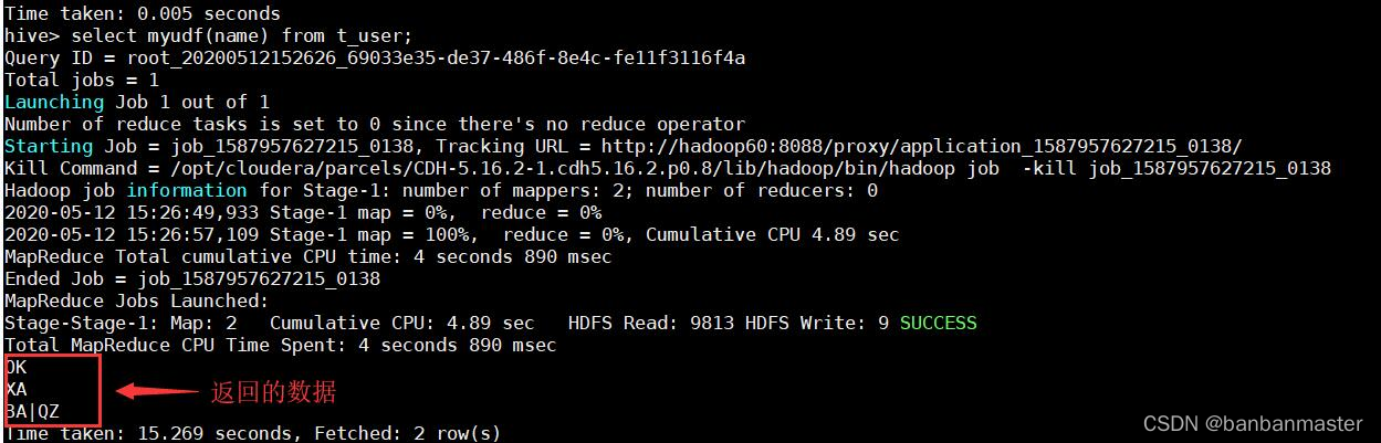 4.为UDF类起一个别名,create temporary function myudf as ‘com.master.HiveUDF.MyUDF’;注意,这里UDF只是为这个Hive会话临时定义的;