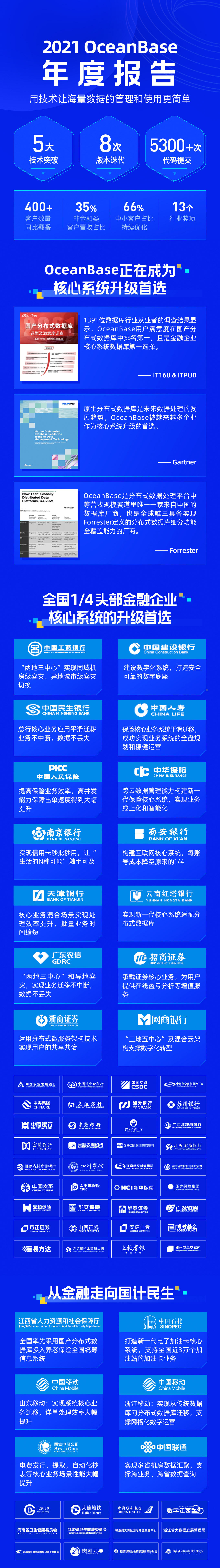 杨冰认为:“这表明 OceanBase 在产品解决方案、服务等方面已经能够胜任金融场景的考验,也得到了客户的充分信赖。”在做扎实金融场景的同时,2021年OceanBase 更是从金融走向国计民生,助力千行百业。