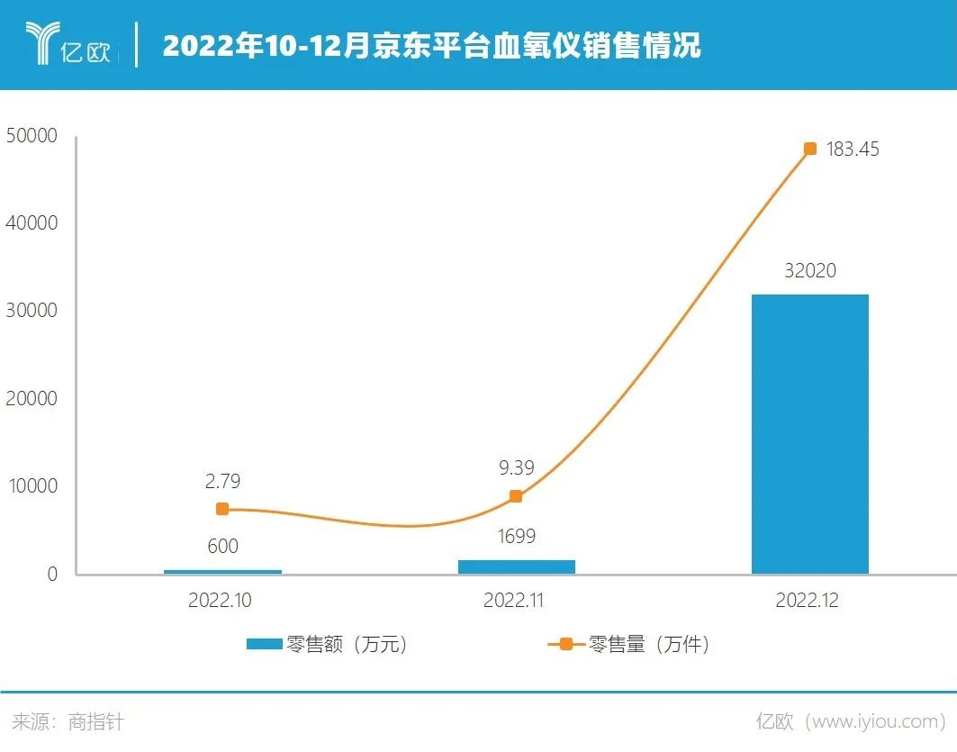 根据商指针提供的数据,2022年12月京东平台的血氧仪销量达183.4万件,环比增长1854%。百度指数显示,“血氧仪”一词近一个月内的搜索指数同比上涨7523%,环比上涨2093%。