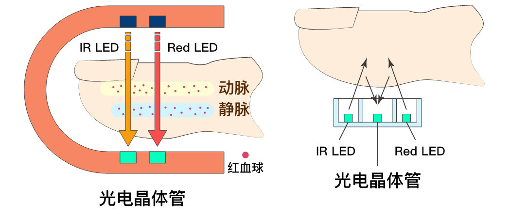 不同之处在于,血氧仪采用的是透射脉冲测定法,使用时会夹在血红蛋白浓度较高的手指部分,光学探头的发射端和接收端分别在手指两侧,通过测定透过手指的光波来计算结果。