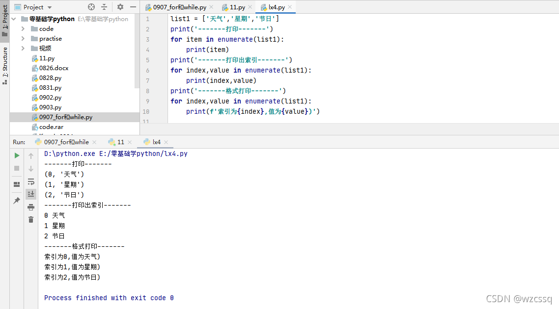 3、遍历列表,用 enumerate() ,表示索引值也将打印出来,索引与value值以元组形式打印出,若想分别获得索引、value值,用变量index、value获取即可