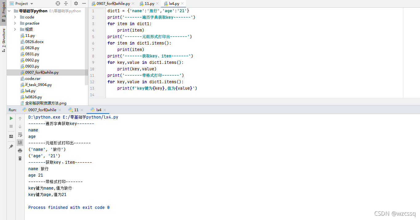 4、遍历字典,默认读取key,,items()取key、value值,若不用变量获取则以元组形式展示
