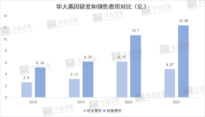 虽然营收下降,但华大的销售费用还在不断增多。2018年销售费用是研发支出的1.98倍,而到2021年已经增长到2.54倍。不断扩大的销售/研发比例也是外界质疑的重要一点。从目前状况看,回到2020年营收巅峰状态的难度很大。
