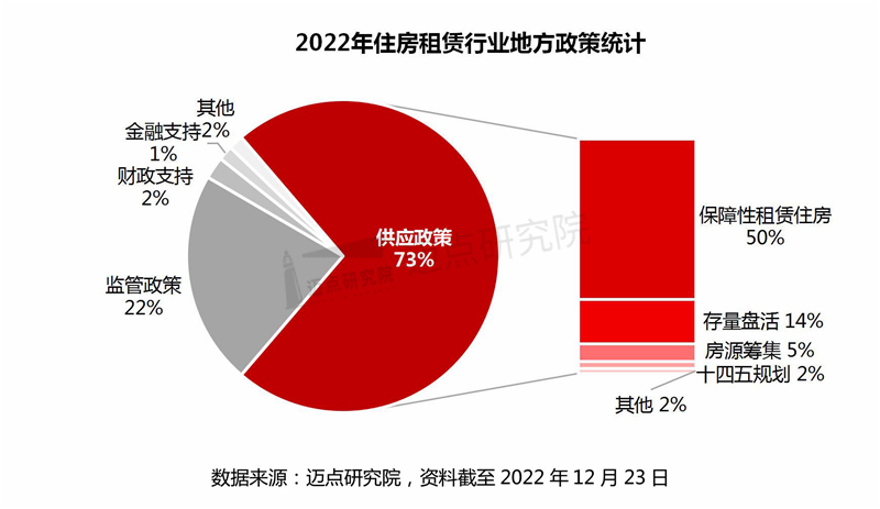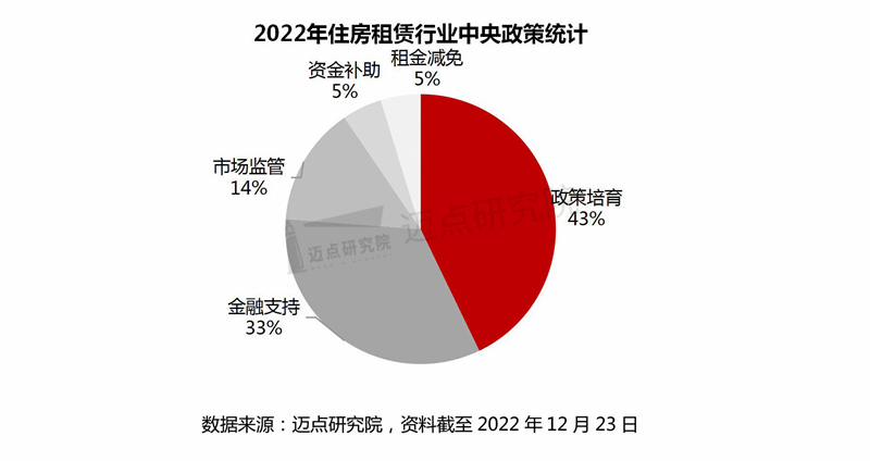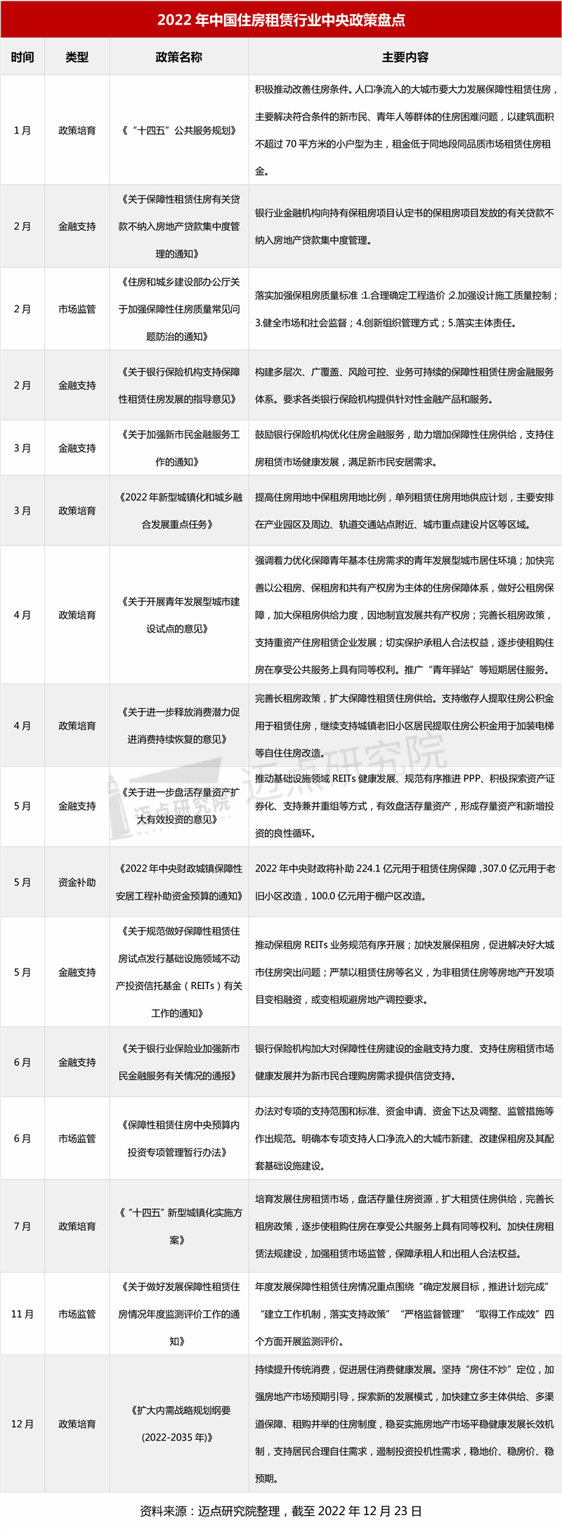 2022年,中央各部门高度重视保租房发展,不断加大对住房租赁市场发展的支持力度。中央政府确立大保障租赁体系,在明确基本制度、加大金融支持政策、推进土地供给政策、盘活存量住房资源、落实资金补助和租金减免政策方面,加快培育和发展住房租赁市场。