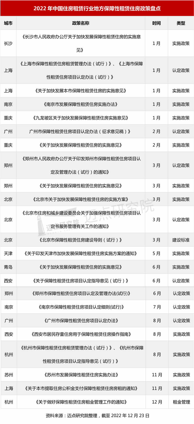 2022年,从中央到地方政府高度重视保障性租赁住房发展,大力增加保障性租赁住房供给。“十四五”时期,住建部提出40城拟增加650万套保障性租赁住房,各地加速落实保障性租赁住房政策。围绕保障性租赁住房的管理与落地,北京、成都、广州、杭州、南京、青岛、上海、苏州、天津等城市出台保租房实施方案、项目认定办法、建设标准、租金管理等细化政策,加速推进了保租房筹建。