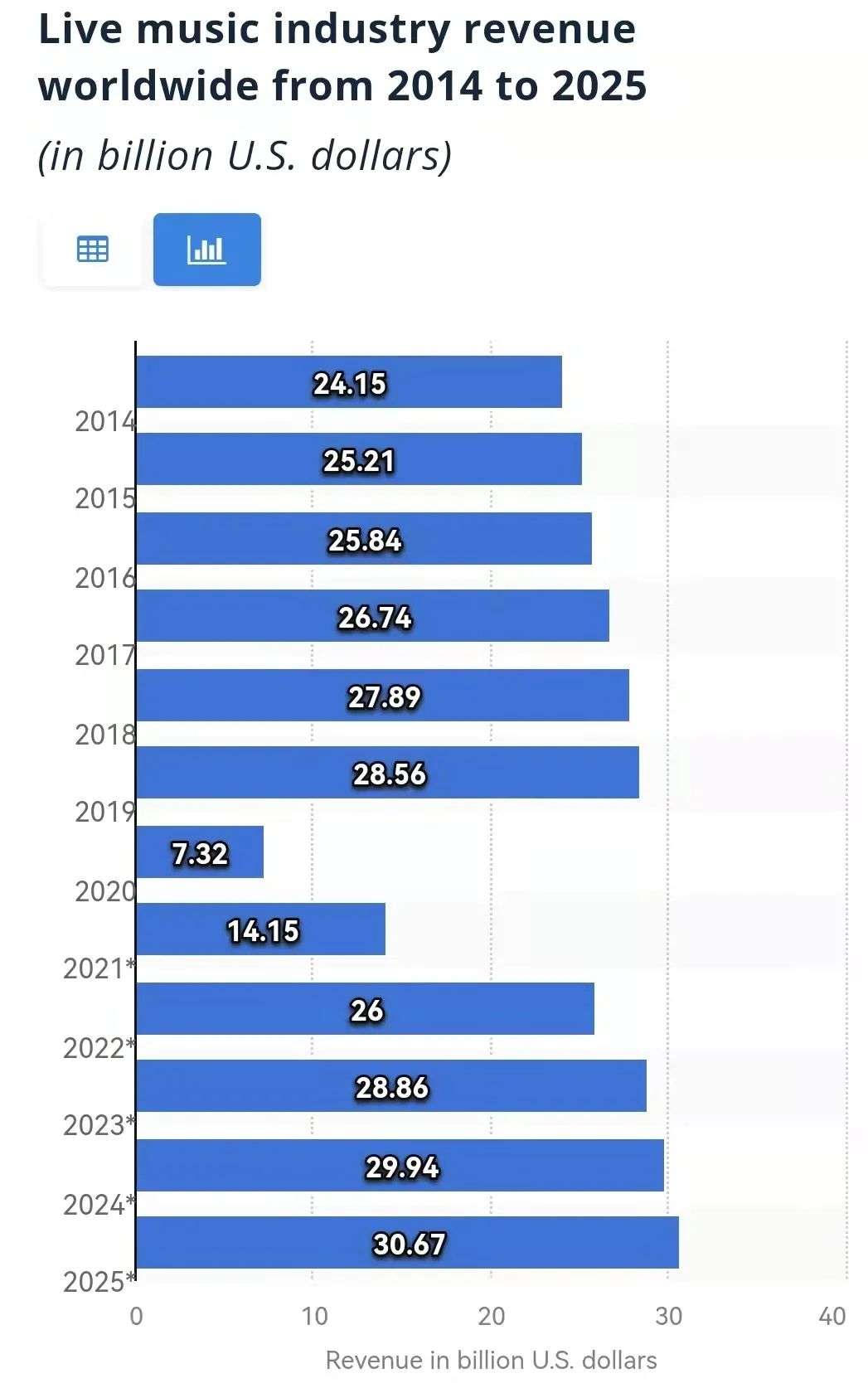 《2021五一档演出观察》显示,五一期间Livehouse票房较2019年同期增加448%,观演人次增长326%。与此同时,国外演出市场也在迅速恢复中,据统计公司statista预测,全球音乐演出市场收入将在2022年恢复疫情前的水平,预计到2025年增长到超300亿美元。