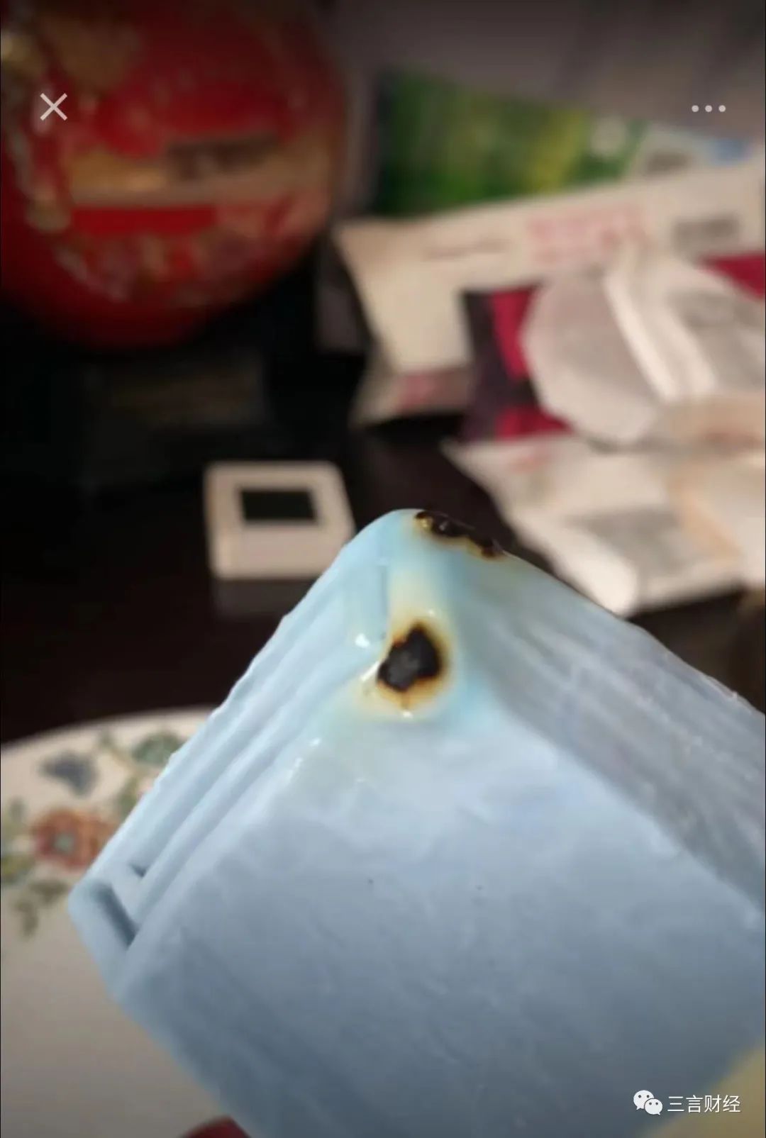 出乎意料的是,火烧实验中,我们发现雪糕也能够被烧糊,三款雪糕都存在烧糊现象,其中钟薛高的比较明显。