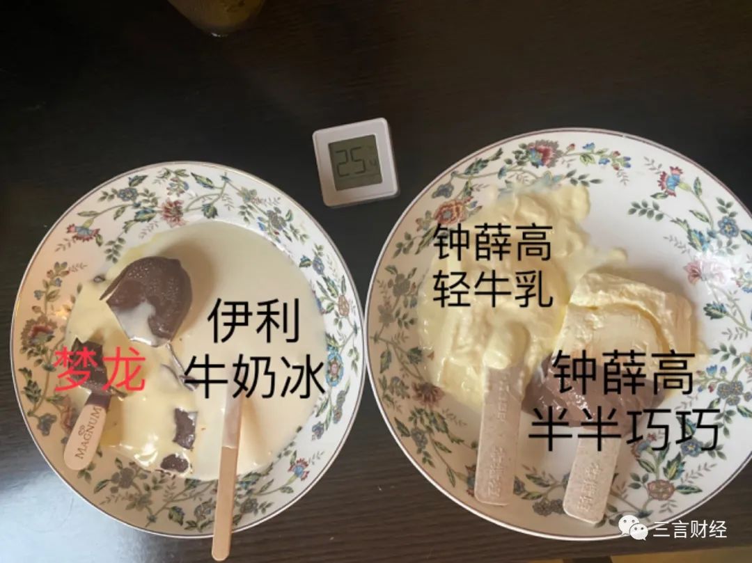 静置30分钟时,室温25度,梦龙除了外壳外内部完全融化,伊利牛奶冰呈现几乎无法完全拿起状态;钟薛高两款雪糕中,轻牛乳雪糕开始出现碎裂情况,而半半巧巧口味则只是软化,尚能完整拿起来。