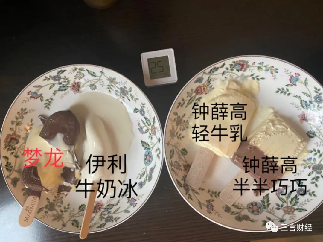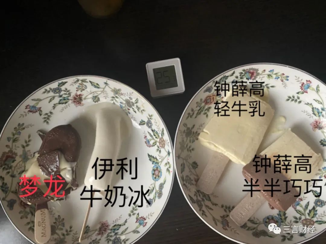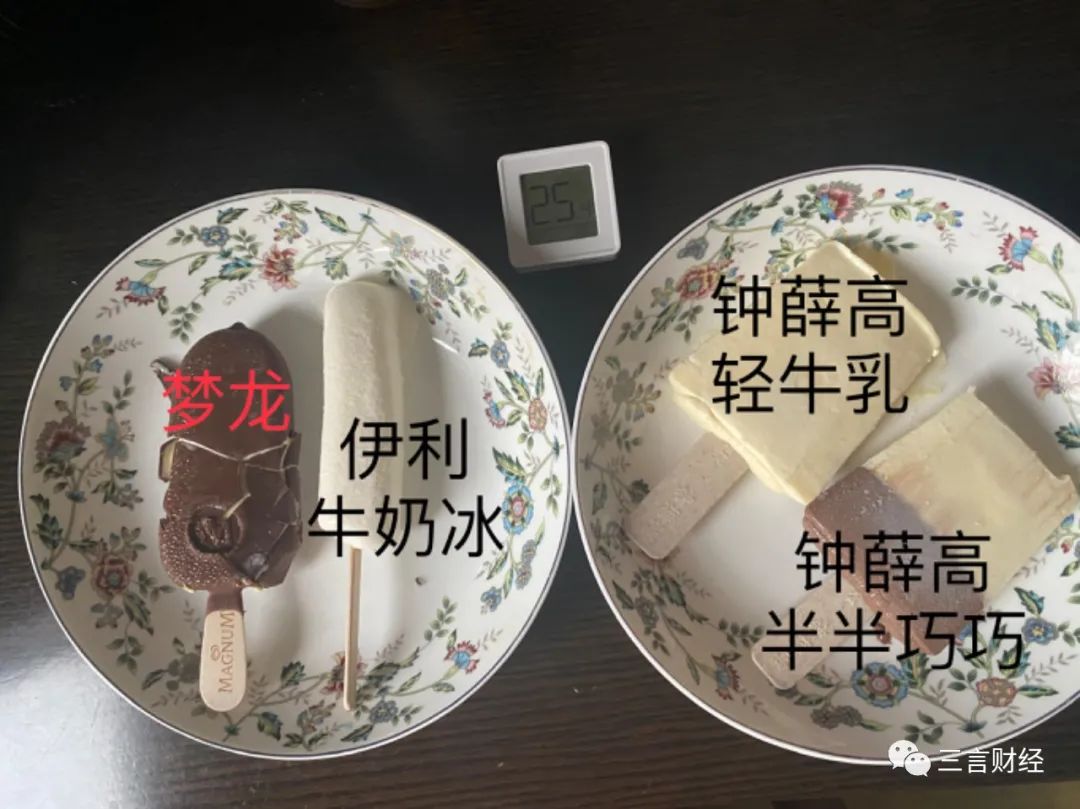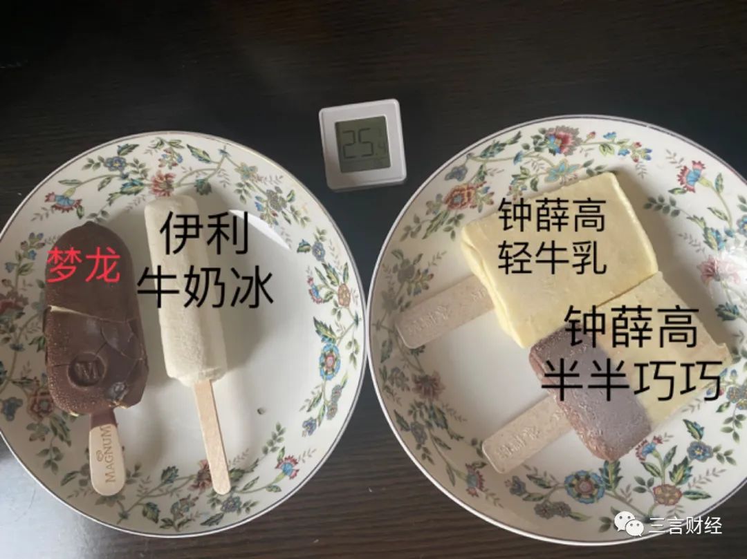 这次测试选择了梦龙一款巧克力外壳雪糕、伊利牛奶冰、钟薛高半半巧巧雪糕和钟薛高轻牛乳雪糕,室温自始至终保持在25摄氏度。