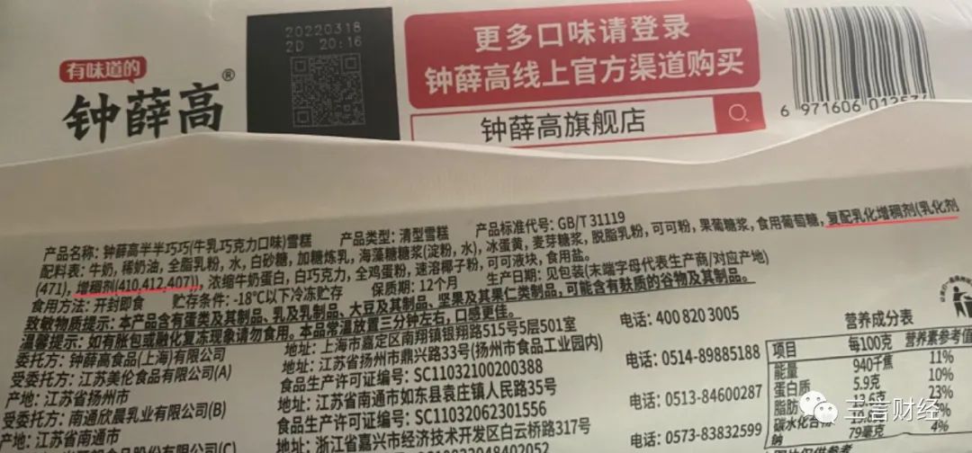 钟薛高半半巧巧口味配料表中显示,添加复配乳化增稠剂(乳化剂(471),增稠剂(410,412,407))等。