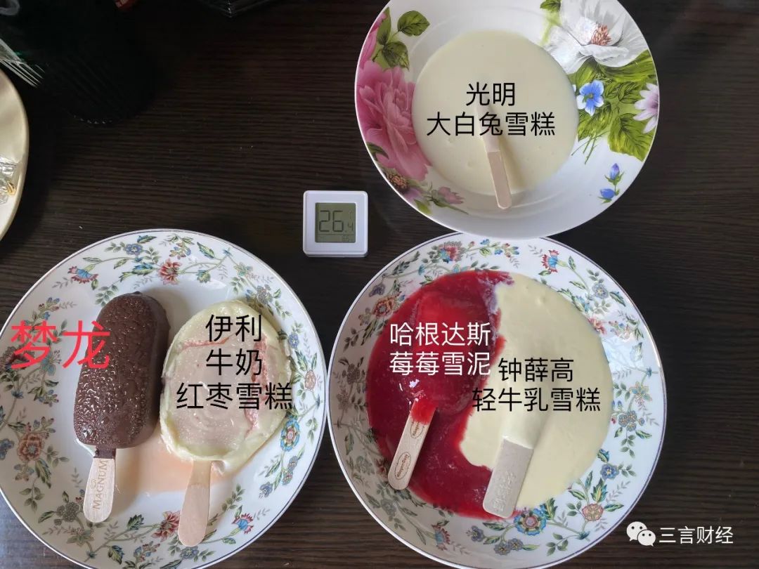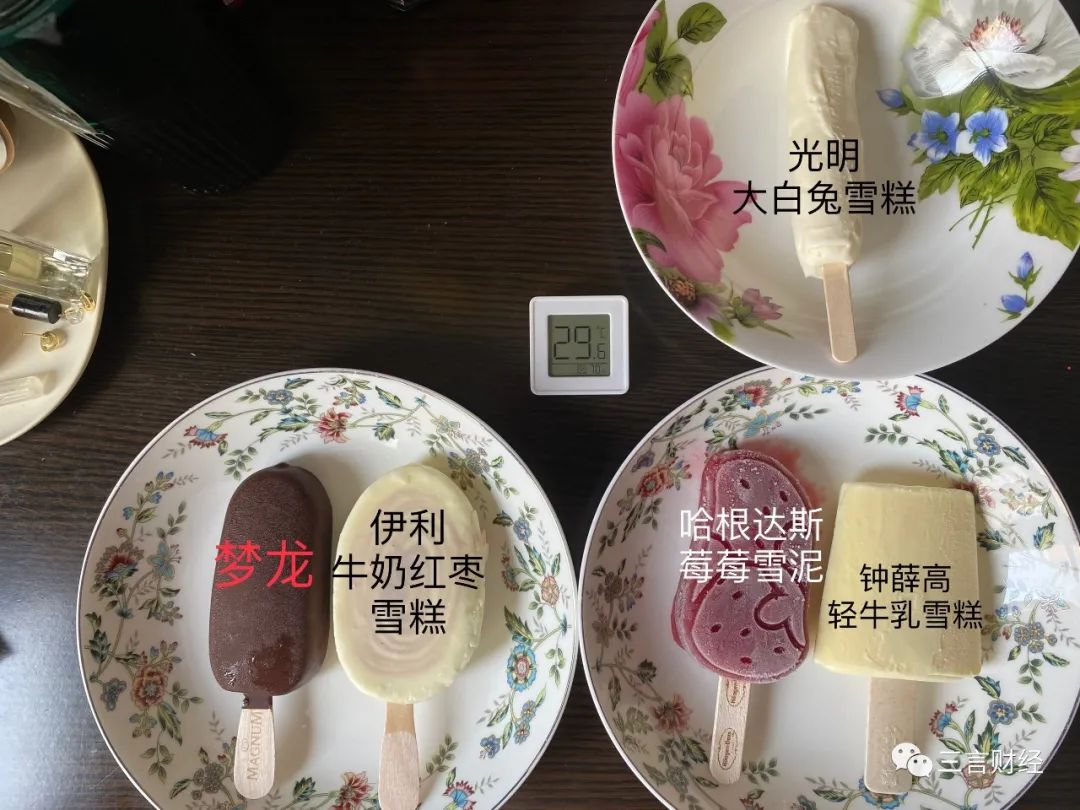 首先进行测试的雪糕一共五种,分别是梦龙一款巧克力雪糕、伊利牛奶红枣口味雪糕、哈根达斯莓莓冰激凌雪泥、钟薛高轻牛乳雪糕和光明大白兔雪糕。