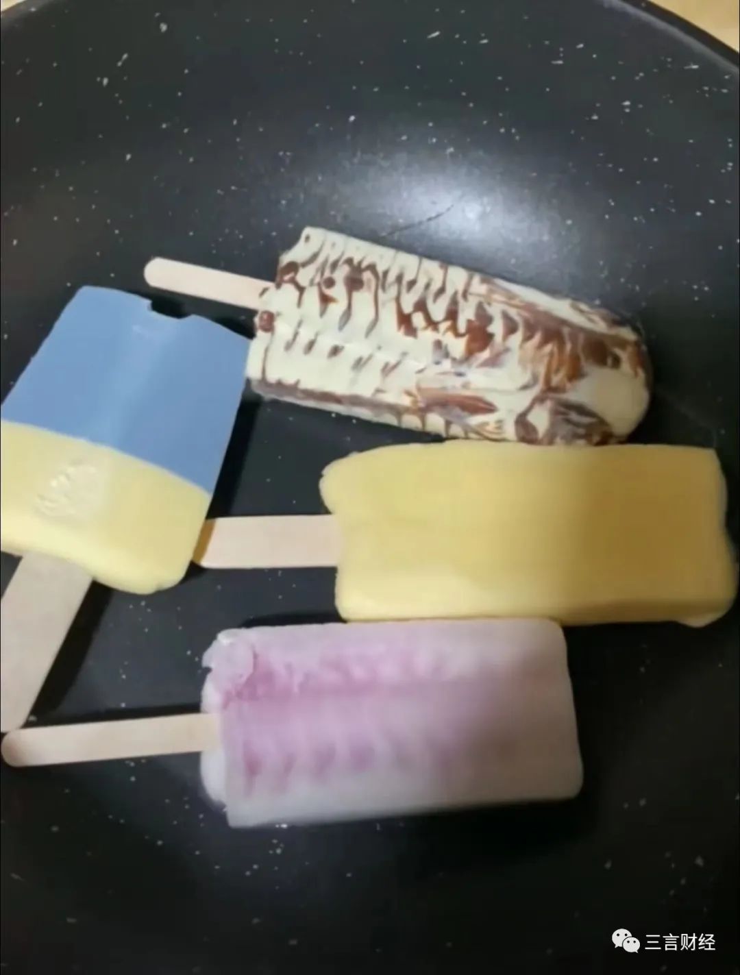 本轮测试中,三言选用了钟薛高海盐椰椰口味、马迭尔原味老冰棍、随变和冰工厂四款雪糕。测试方法就是直接将雪糕丢锅里,点火后测试多久完全融化。