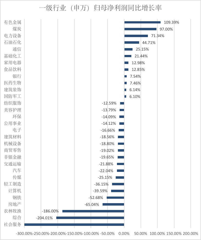 从增长角度来看,煤炭、有色金属等12个行业中报利润同比增长,占比近四成。其余19个行业则同比下行,其中农林牧渔、社会服务甚至出现亏损。景气度较高的行业集中在资源类板块,有色金属、煤炭分别实现109.39%和97.00%净利润增速,电力设备、石油石化增速也均超40%。同时,上述行业的营收增速也均排在前5位。