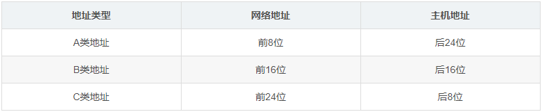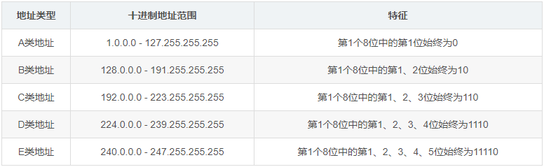 这儿的IP地址表现形式参考二进制,若从十进制表现形式(例1.0.0.0)来看,点隔开了每个字节(1字节8位),也就是说A类地址第一个字节是网络地址、后三个字节是主机地址。