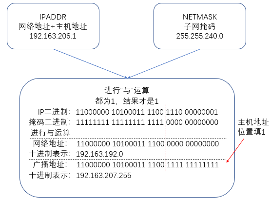 比如一个C类IP地址:192.168.1.1,那么网络地址:192.168.1.0、主机地址:0.0.0.1