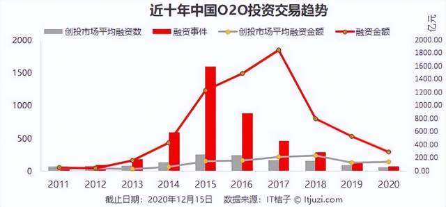 据IT桔子的数据显示,似乎这种说法没有错,从风口的规模/量级来看,近几年来,创投圈最大的风口是O2O。2015年,O2O领域的创投活动最为鼎盛,当年发生了1600起投资事件,以此为基准,一年后,投资数量就锐减至一半;到了 2020 年,O2O投资事件数仅是2015年的5%,可见90%以上的O2O项目都不受资本待见了。