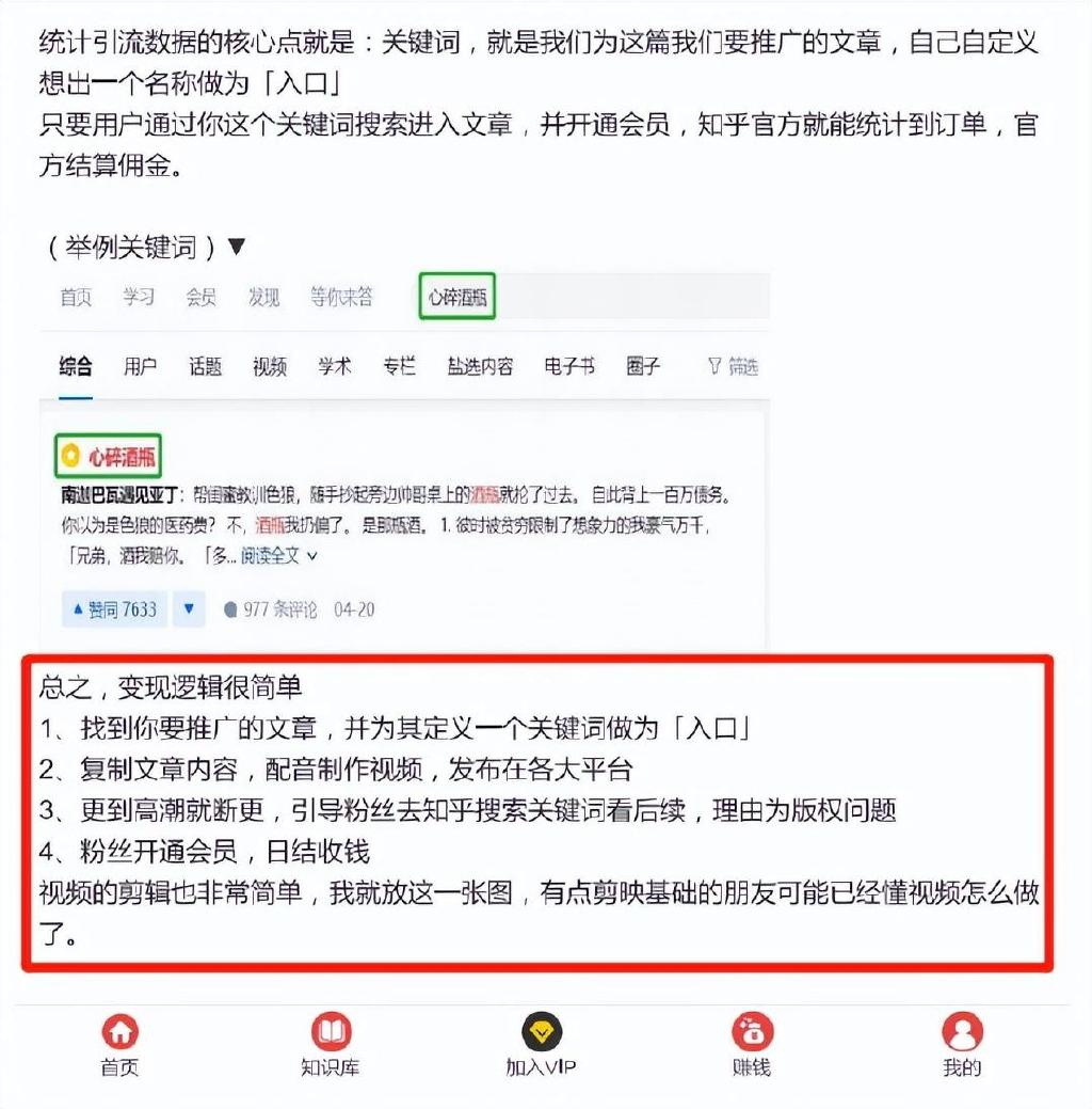 而获得流量分成的方式也并不复杂:用户在看到这条视频时,如果被故事剧情吸引,自然就会想看到文章后续,发布者只要在评论区提供自己拟定好的关键词以供用户到知乎搜素即可。后续一旦用户为了续看小说而购买了知乎会员,便算作一单转化,发布者可以得到6-12元不等的分成。