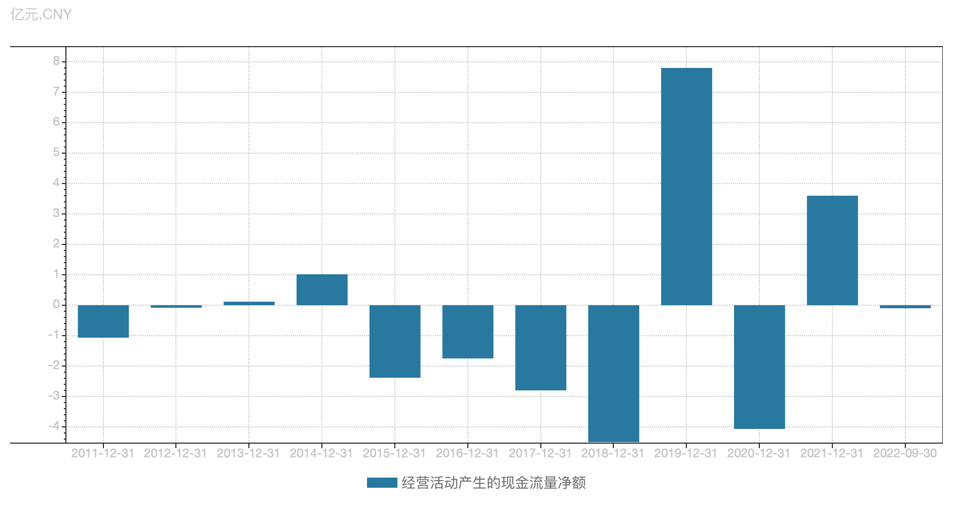 与之相对的是堪忧的收益质量。2011年以来,华扬联众虽然净利润呈增长态势且均为正,但经营现金流却只有4年为净流入。2015年至2018年其经营性现金流分别为-2.38亿元、-1.76亿元、-2.8亿元、-4.51亿元,其后也只有2019年、2021年为正。2022年前三季度其经营性现金流再度转负,为-1015万元。