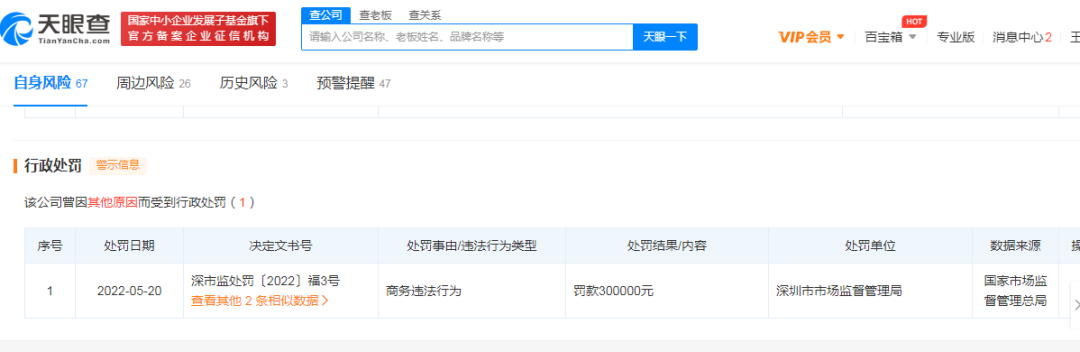 天眼查数据显示,深圳市市场监督管理局在2022年5月20日对广东快客电子商务有限公司(KK集团主体公司)开出了30万元罚款,处罚原因显示商务违法行为,决定文件号为深市监处罚〔2022〕福3号,处罚的依据是《商业特许经营管理条例》第二十四条第1款。特许人不具备本条例第七条第二款规定的条件而从事特许经营活动的,由商务主管部门责令改正,没收违法所得,处10万元以上50万元以下的罚款,并予以公告。