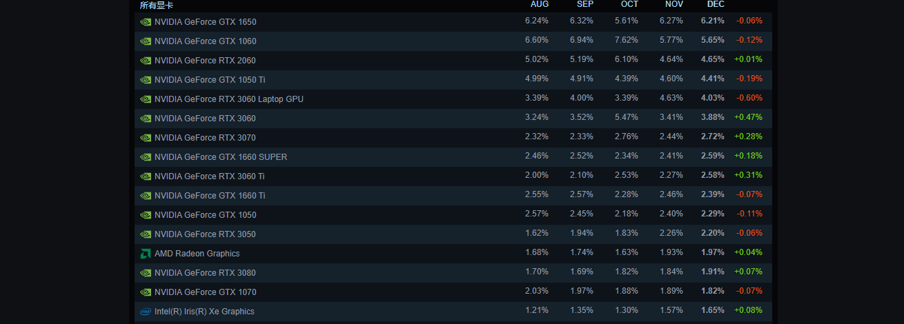 然而,尽管英特尔信心十足、诚意满满,但是目前看来锐炫系列的市场表现却不如人意。从Steam商店的硬件统计来看,直到2022年末,英特尔在显卡统计里面持有率最高的依然是Iris Xe核显,而理论上最亲民的A380显卡甚至没有进榜,在京东等电商平台的销售数据更是只有寥寥数千块。