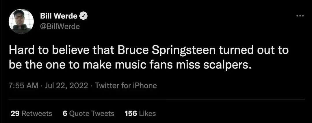 这不仅在乐迷之间引发众怒,还引发很多从业者的批评。7月22日,前公告牌编辑部负责人Bill Werde在推特上调侃道:“很难相信Bruce Springsteen是会让乐迷开始想念黄牛的人。”