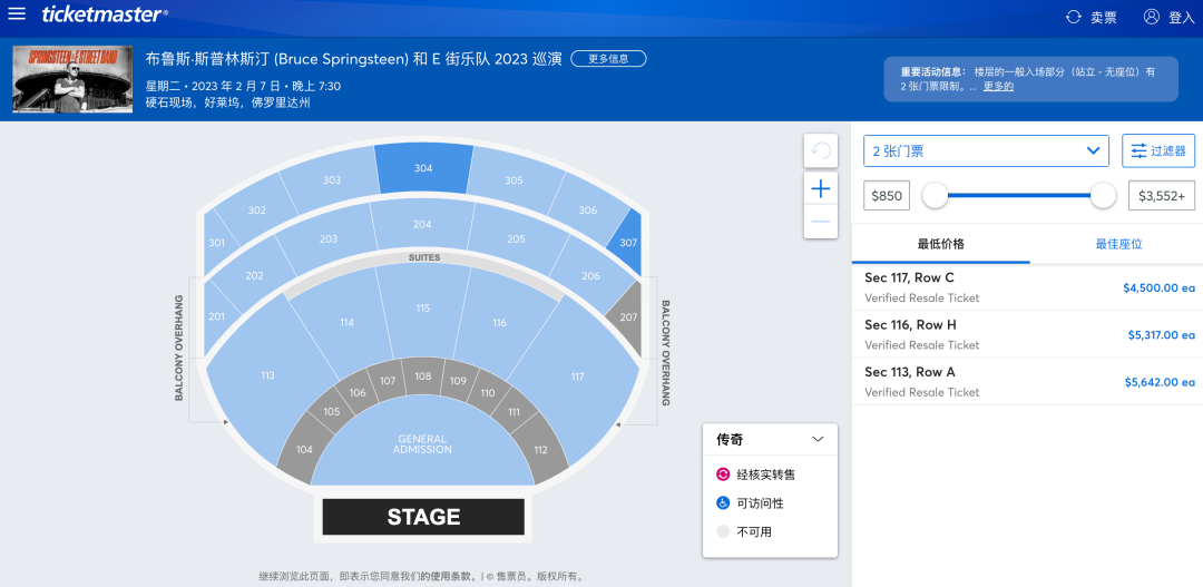 作为音乐版权价格超过Bob Dylan的摇滚巨星,Bruce Springsteen的巡演显然是供不应求,最终呈现在售票平台上的局面便是所有门票价格飞涨。
