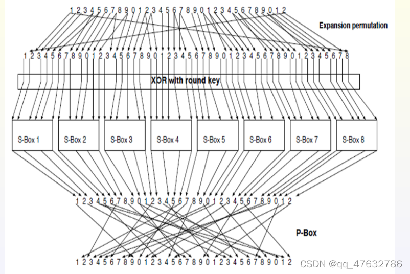 - S盒操作胡为2位(8*4),经过P盒重新置换重新排列