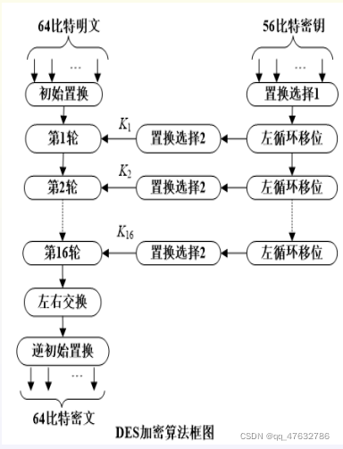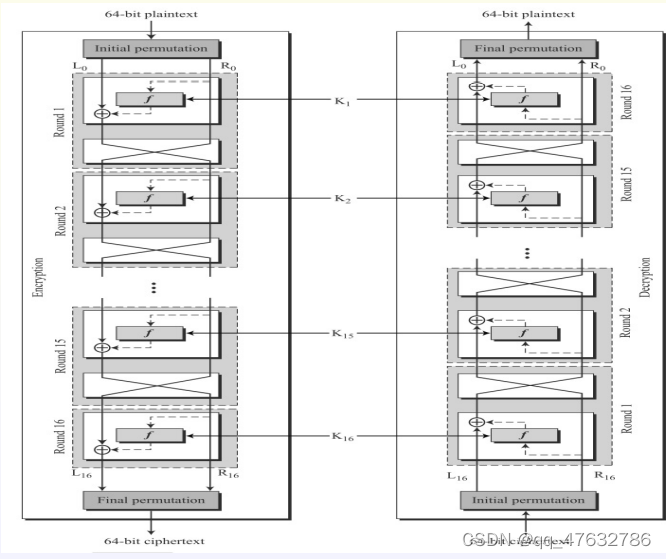 - DES算法是基于Feistel密码结构的,其加密盒解密过程是相同的,只是轮密钥的使用顺序相反而已,所以无需加密过程可逆。