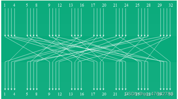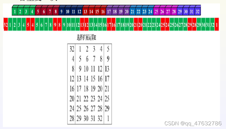- 从相邻两组的邻近位置各取1位形成扩展置换E,其中16个位各重复一次