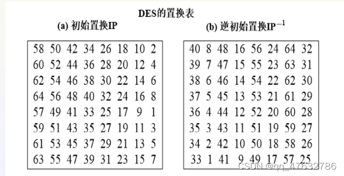 - IP:输入的第58位置换位输出的第一位,输入的第50位置换位输出的第二位,以此类推。
