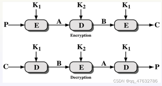 - 加密:C = EK1 (DK2 (EK1 [P]))