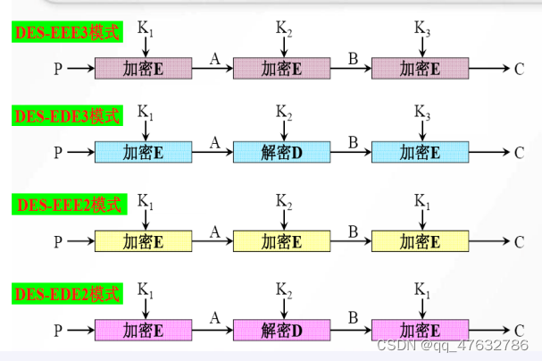 - 3DES 有168位密钥,3DES可以用2个或3个密钥