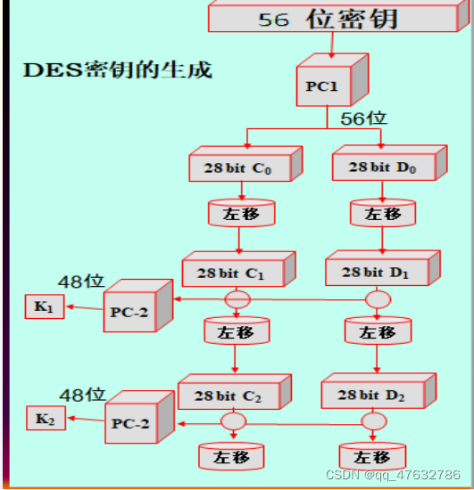 - 移位后的结果作为求下一轮子密钥的输入,同时也作为置换选择PC2的输入,PC2是压缩置换从56位中选48位