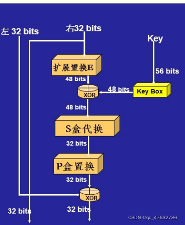 - 将右半边32位作为左半边,而左半边32位与Pbox输出的32位进行异或,并将运算结果作为右半边。
