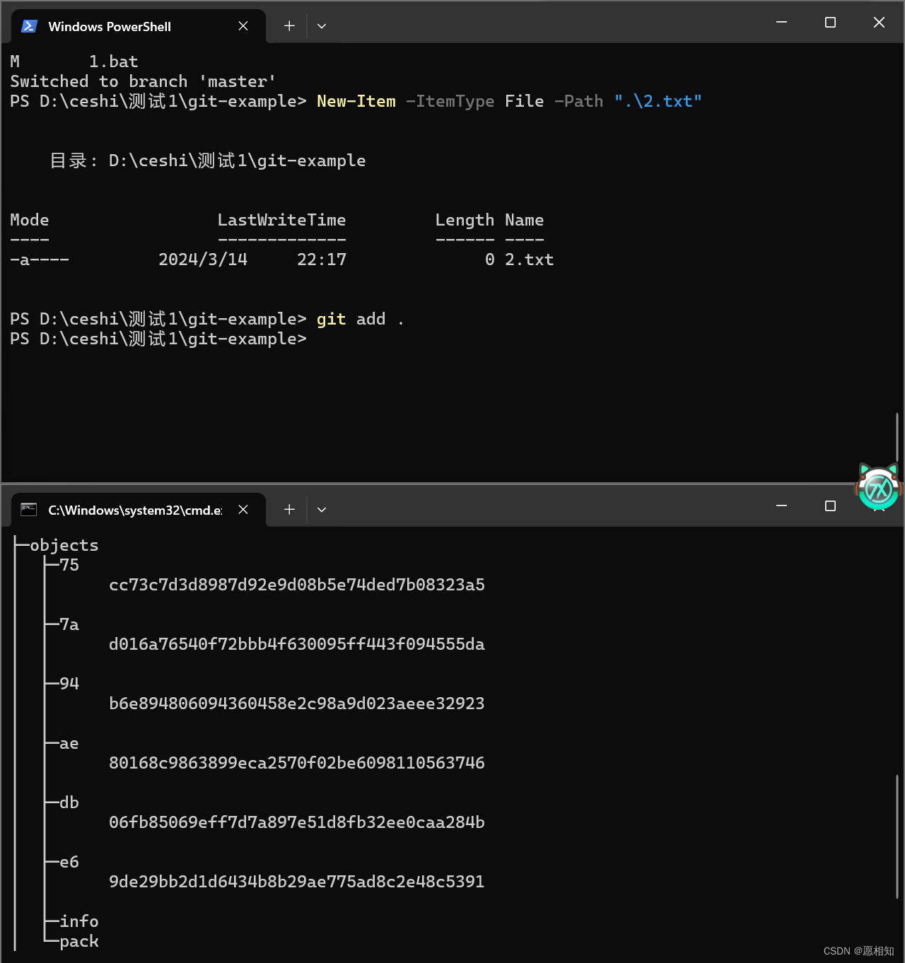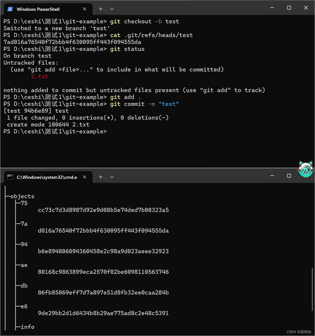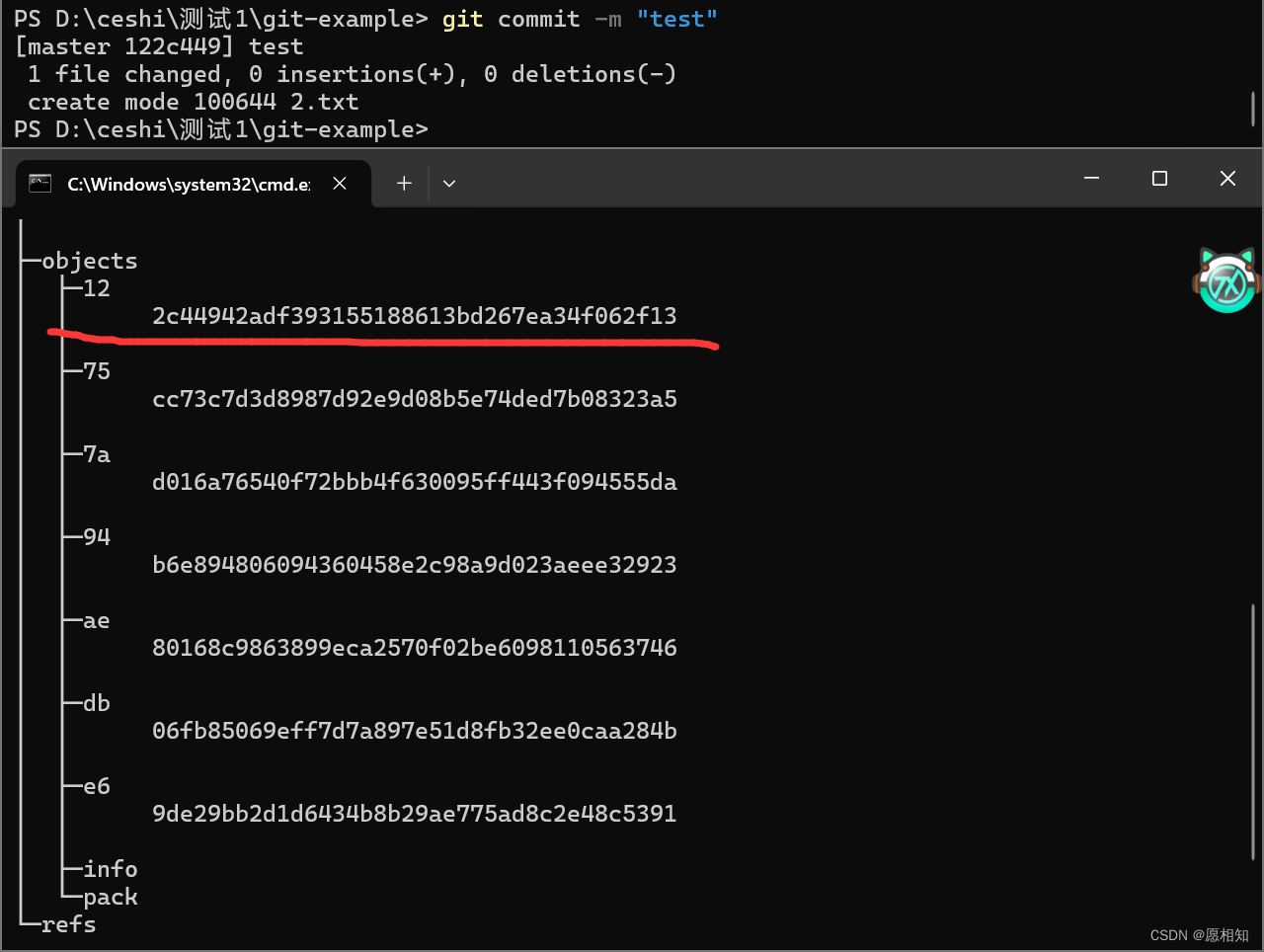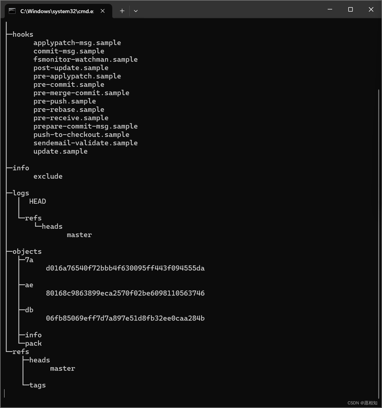 我们发现objects文件夹下多了“7a,ae,db”三个东西,后面多了一串哈希码