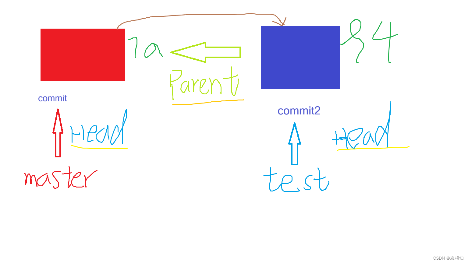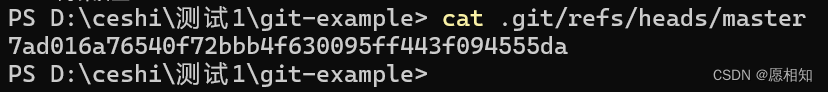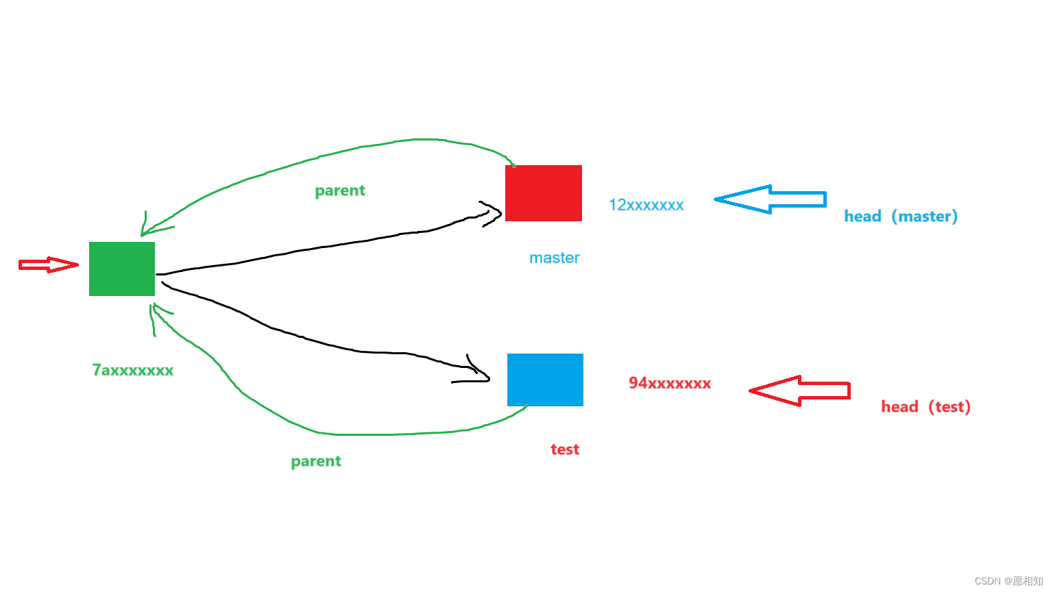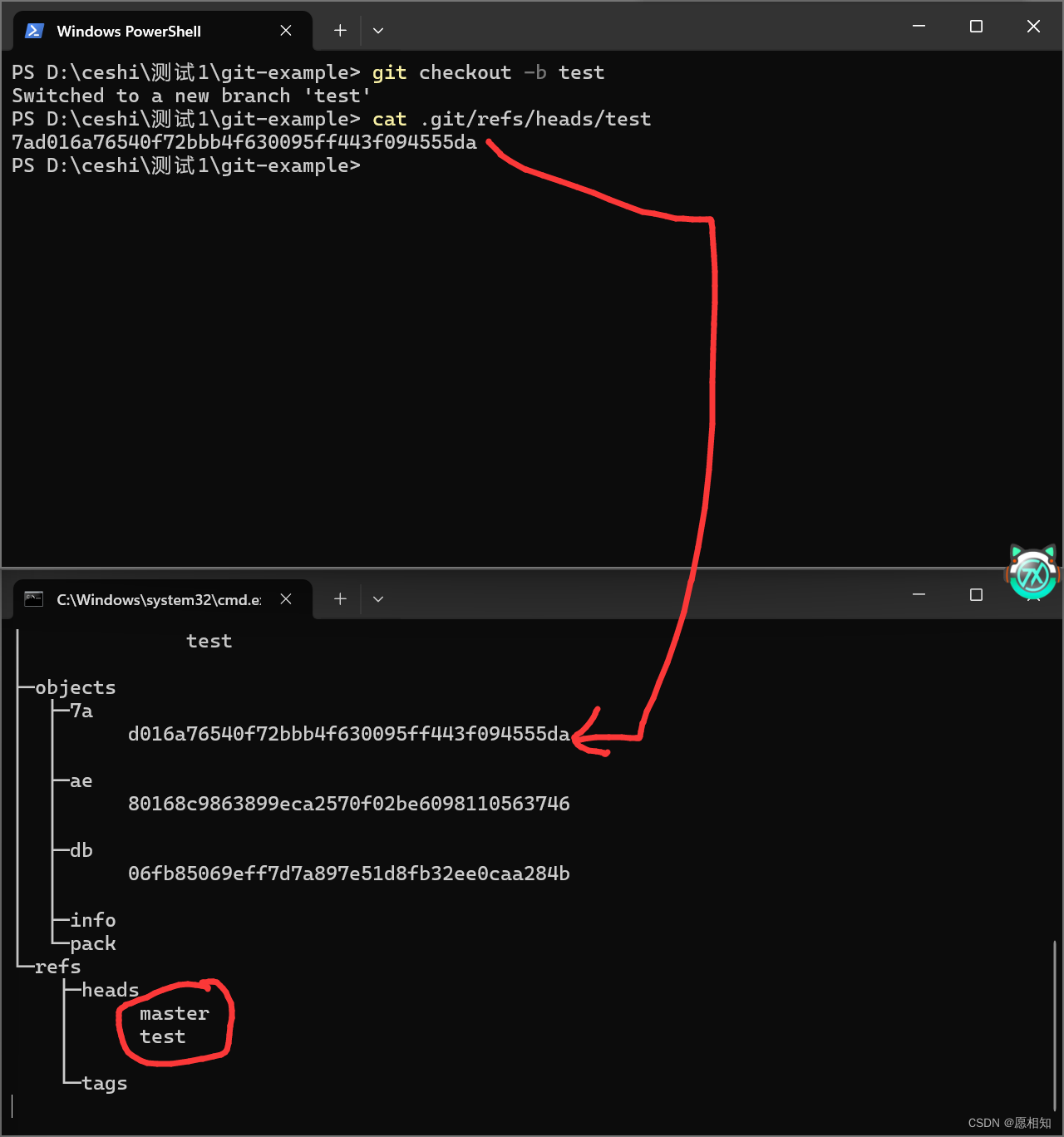 可见,创建新分支之后,heads文件多了一个test文件,并且新分支指向7a这里(因为我们的test是在master刚提交之后新创建的)