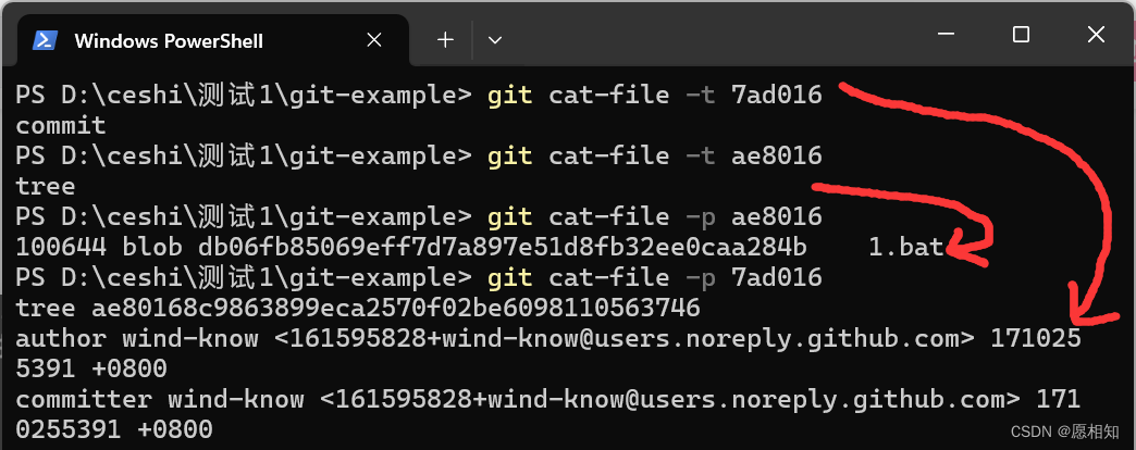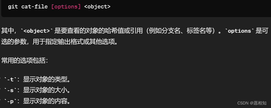 ,这是 Git 命令中的一个底层命令,用于查看 Git 对象的内容。Git 使用对象来存储文件的内容和元数据。每个对象都有一个唯一的哈希值标识符,它基于对象的内容和类型计算而得。