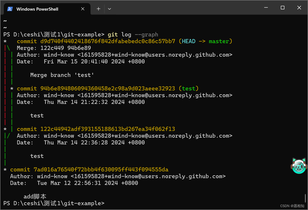接下来,我们将刚才测试的两个分支合并,看看会有什么变化