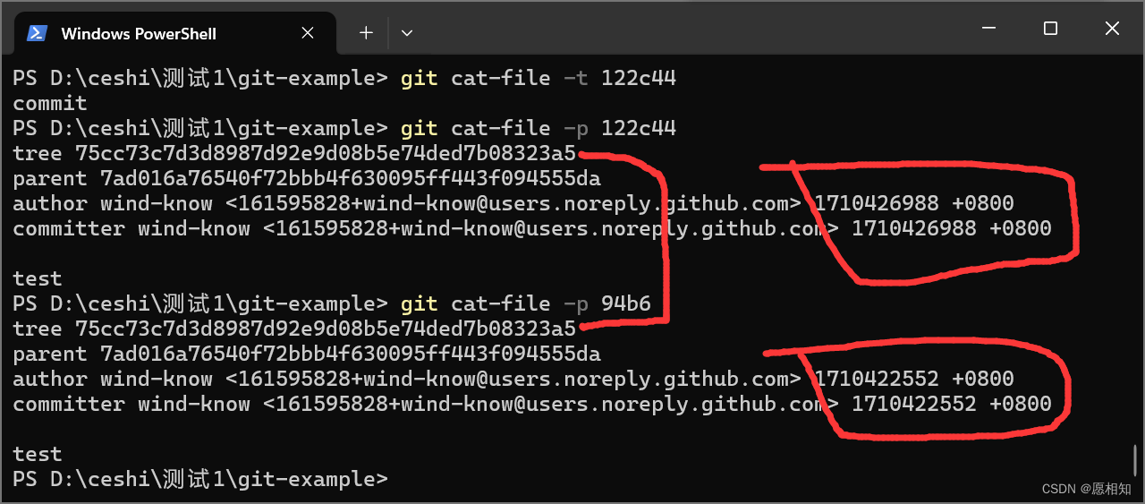 我们可以看出来,两个的内容几乎完全一样,所以并没有出现新的tree文件和blob文件,而是直接复用了以前的key,但是因为时间的不同,时间这一内容保存在commit中,所以commit文件的哈希码也不同,这样的就可以很方便的在git使用时解决哈希冲突。