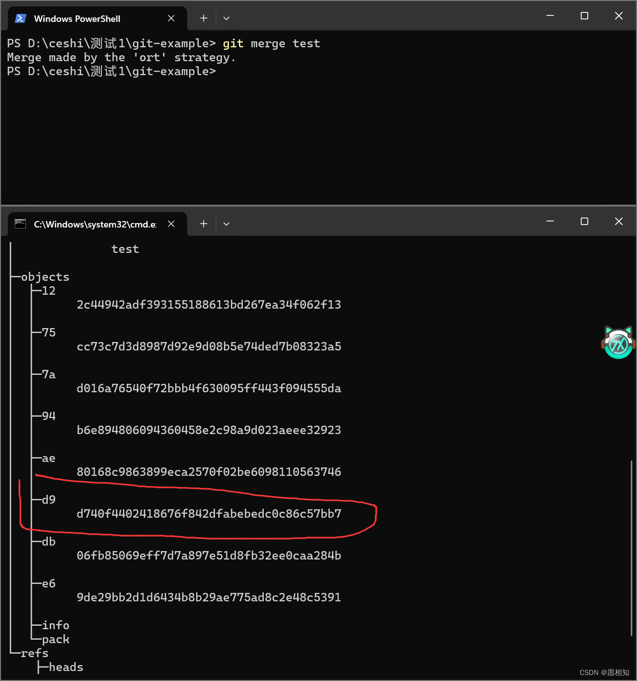 这是一个commit文件,我们注意到,他的tree文件与之前一模一样,原因不在复述。同时,我们注意到这个文件的parent指针有两个,分别指向我们test和master的两个commit。