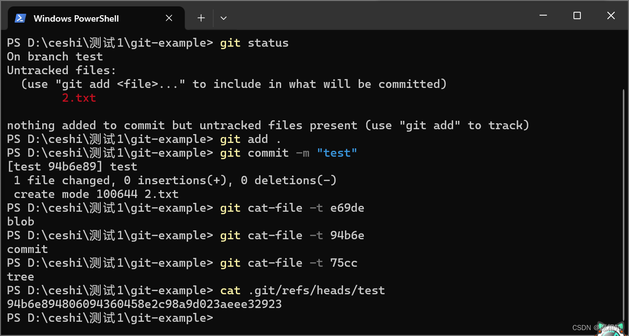 发现多出了94,75两个文件夹,那么此时对他们的类型我们再进行一下测试可知,94为commit,94为tree,e6为blob,并且test分支目前在94这里